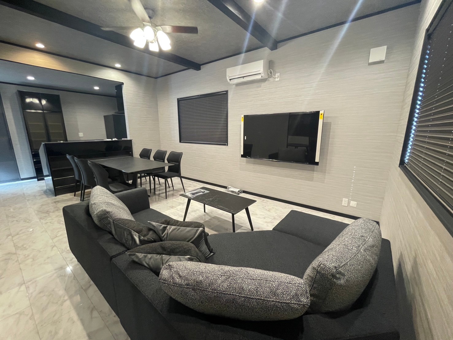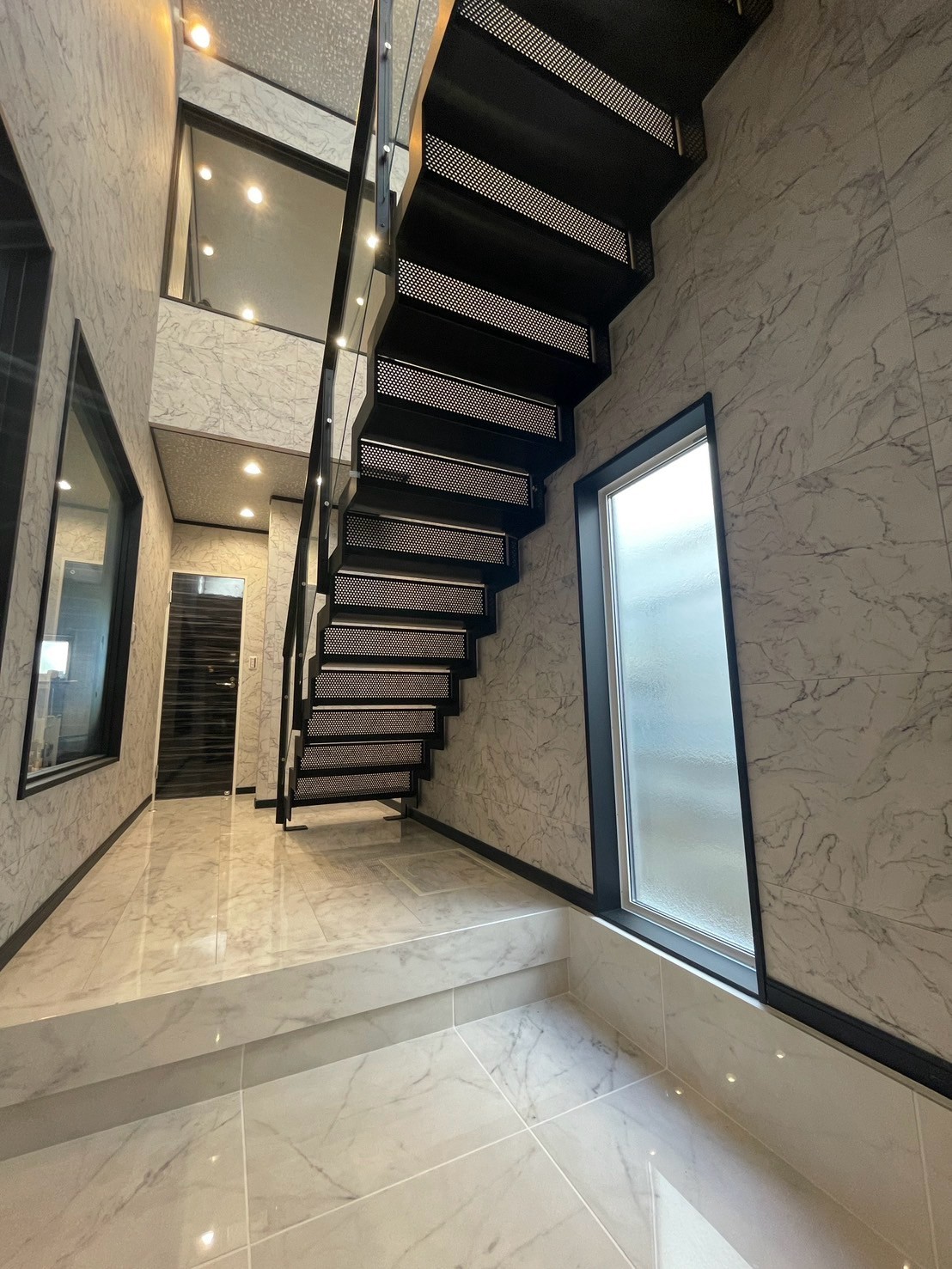 階段を上がると、そこには選び抜かれた素材と美しい陰影が織りなす、品格あるインテリア。落ち着いた色調と直線的なデザインが空間に深みを与え、静けさの中に確かな存在感を放ちます。家具や照明は機能性と美しさを兼ね備え、暮らしのひとときを豊かに演出。