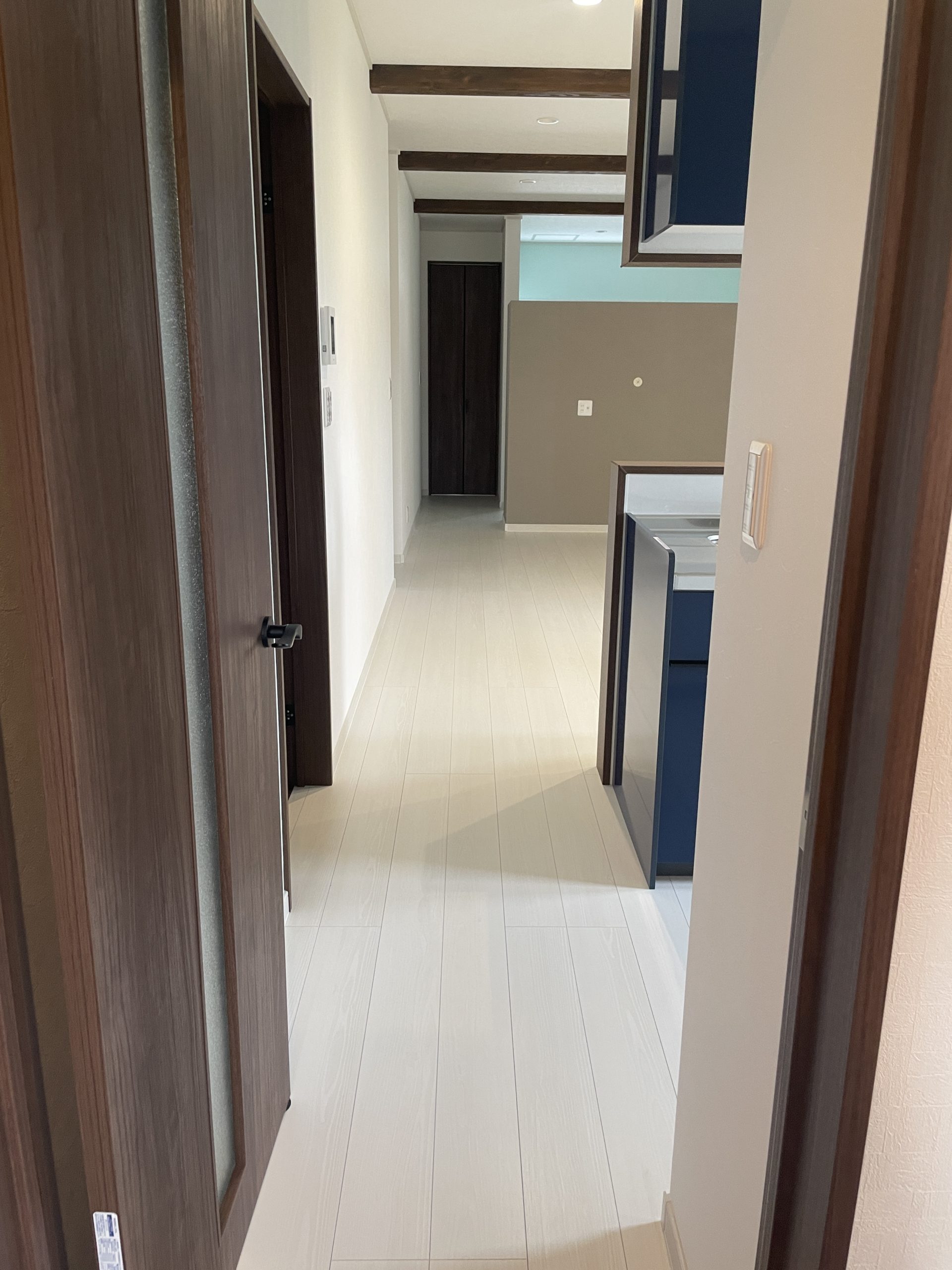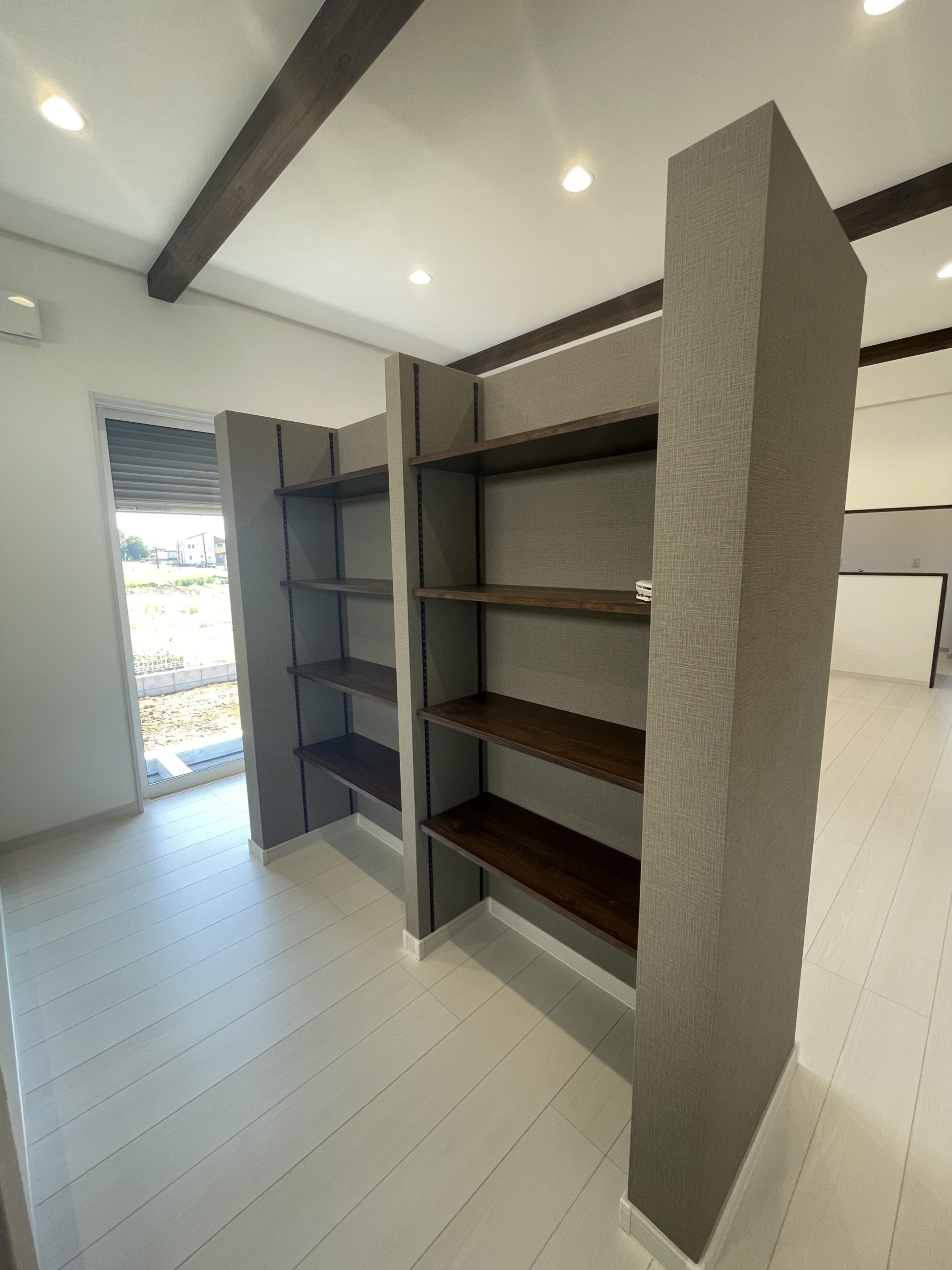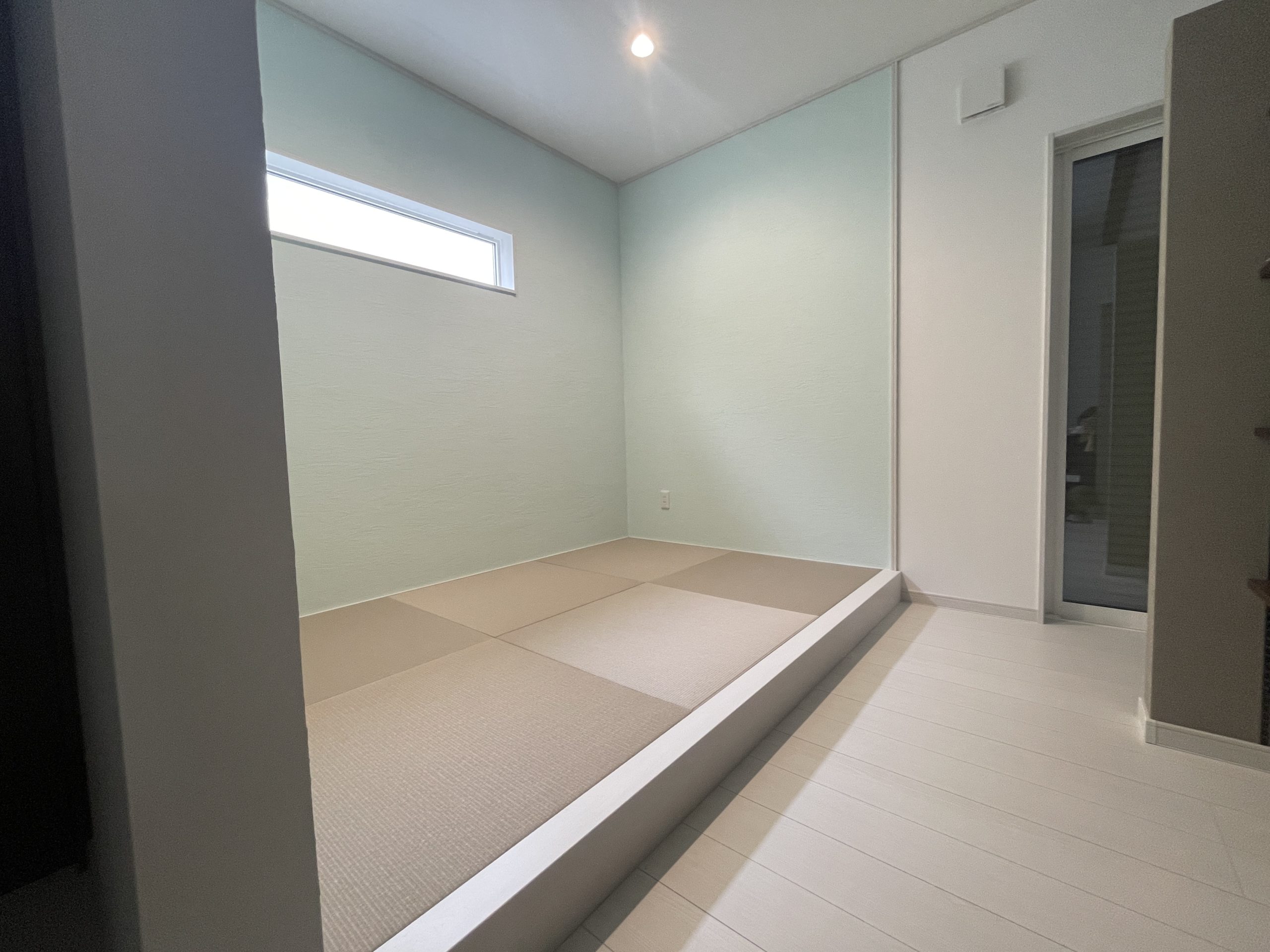 室内に足を踏み入れると、外壁の緑と呼応するような穏やかな空気が広がります。木の質感を活かしたフローリングと天井の梁が、自然の温もりを感じさせ、視覚的にも心地よい空間を演出。窓から差し込む柔らかな光が、時間の流れを優しく伝え、日常に静かな豊かさをもたらします。